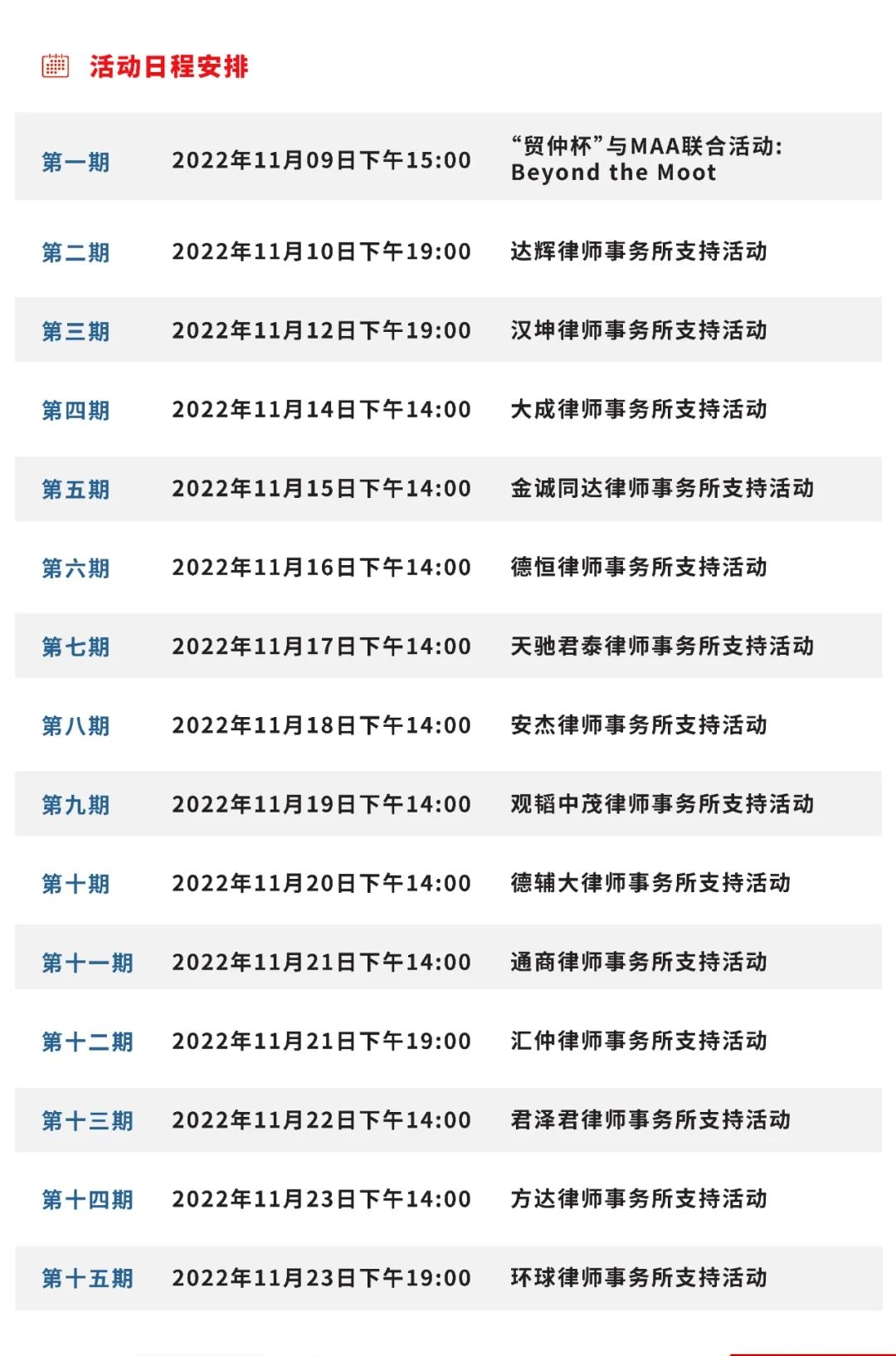 第二十屆“貿(mào)仲杯”國際商事仲裁模擬仲裁庭辯論賽Voice of Moot 系列培訓活動將于2022年11月9日開始,至11月23日結(jié)束,共計15期相關活動?!百Q(mào)仲杯”辯論賽自2000年舉辦至今已歷經(jīng)十九屆,辯論賽始終秉持培養(yǎng)具備國際化實務能力的涉外仲裁法治人才的初心,匯集了大批國際仲裁法律人才。