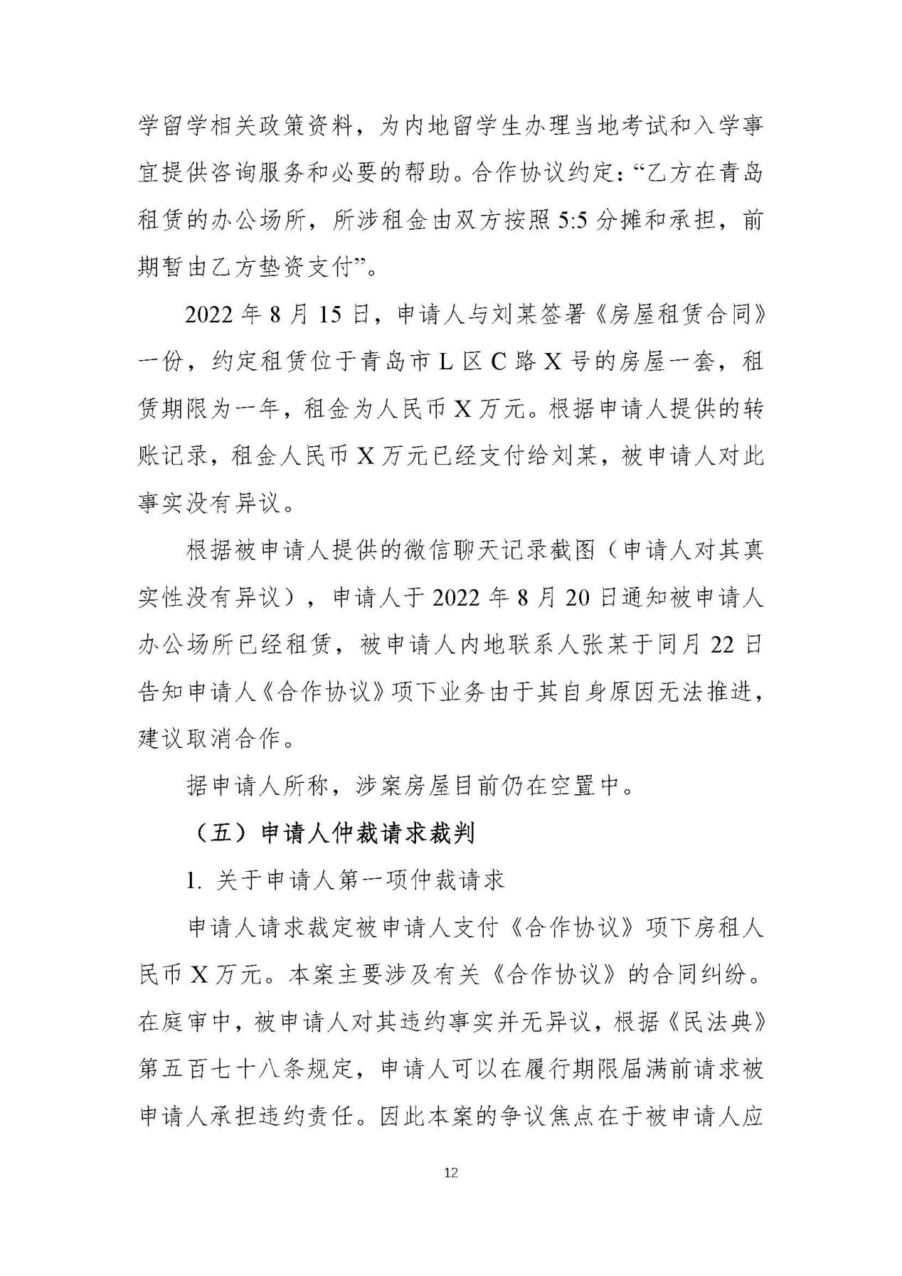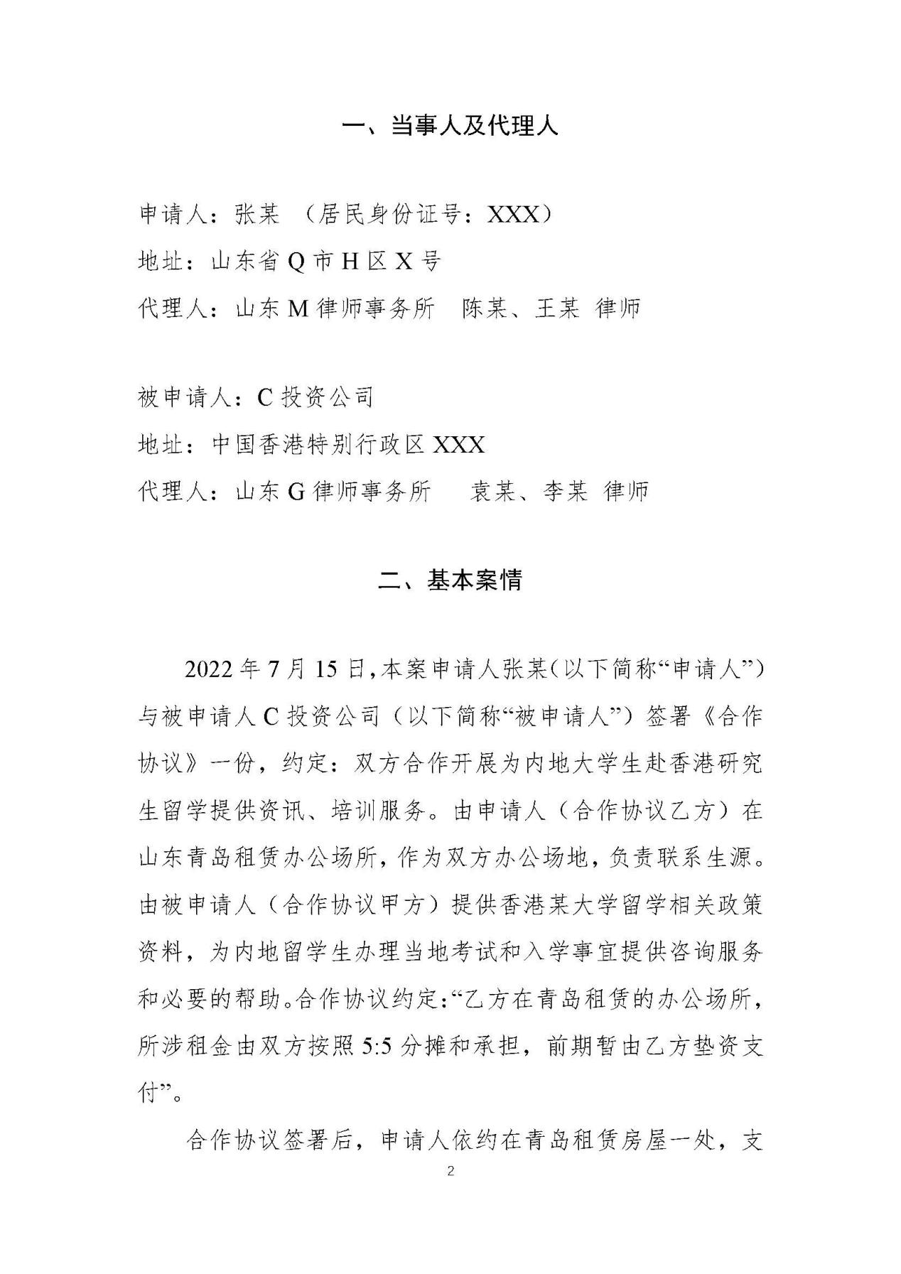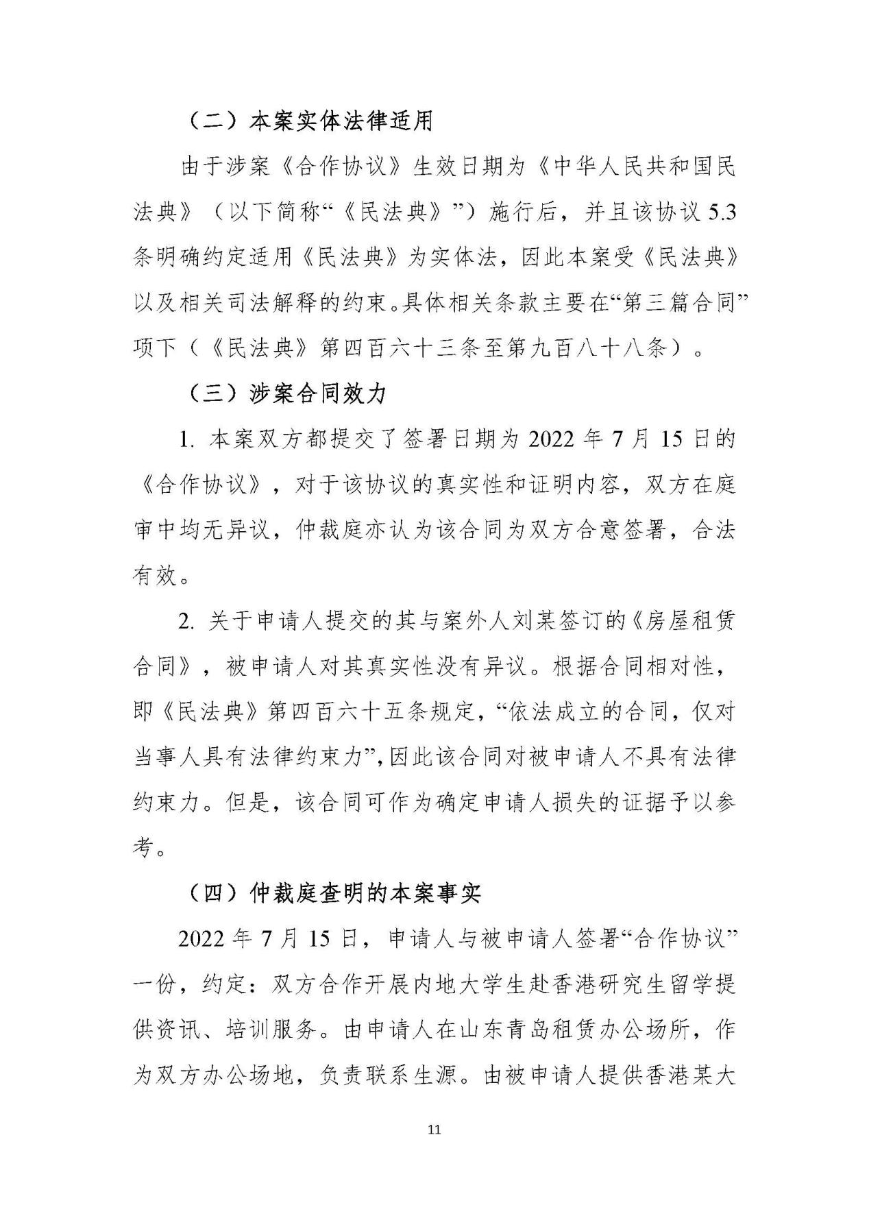 案件涉及一起跨境合作協(xié)議糾紛,申請(qǐng)人為中國(guó)內(nèi)地居民,被申請(qǐng)人為中國(guó)香港公司。雙方約定合作開(kāi)展為內(nèi)地大學(xué)生赴香港研究生留學(xué)提供資訊、培訓(xùn)服務(wù)。雙方因合作協(xié)議的履行產(chǎn)生爭(zhēng)議。本案合作協(xié)議“爭(zhēng)議解決”條款明確約定:“因本協(xié)議引起或與本協(xié)議有關(guān)的一切爭(zhēng)議,雙方同意以仲裁方式解決,適用《中國(guó)海商法協(xié)會(huì)臨時(shí)仲裁規(guī)則》?!薄爸俨猛ビ梢幻俨脝T組成,仲裁語(yǔ)言為中文,仲裁協(xié)議準(zhǔn)據(jù)法為香港仲裁法,開(kāi)庭地點(diǎn)山東青島?!薄氨緟f(xié)議適用《中華人民共和國(guó)民法典》為實(shí)體法,指定機(jī)構(gòu)為中國(guó)海事仲裁委員會(huì)或中國(guó)海事仲裁委員會(huì)青島仲裁中心?!薄爸俨貌脹Q為終局性裁決,雙方同意仲裁裁決在進(jìn)行脫密處理后,可以由指定機(jī)構(gòu)以適當(dāng)方式公開(kāi)。”