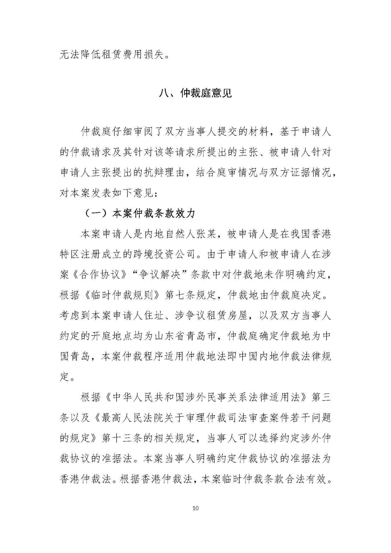 作為境內(nèi)首起適用《海協(xié)臨時(shí)仲裁規(guī)則》的案件,其臨時(shí)仲裁條款的效力備受關(guān)注。仲裁庭專(zhuān)此在裁決書(shū)中予以論述。仲裁庭從案件涉港糾紛的性質(zhì)出發(fā),依據(jù)雙方當(dāng)事人未明確約定仲裁地的事實(shí),根據(jù)《海協(xié)臨時(shí)仲裁規(guī)則》有關(guān)“仲裁地”的規(guī)定,考慮到申請(qǐng)人住址、涉爭(zhēng)議租賃房屋,以及雙方當(dāng)事人約定的開(kāi)庭地均位于山東省青島市,首先確定案件仲裁地為中國(guó)青島,明確案件仲裁程序適用仲裁地法即中國(guó)內(nèi)地仲裁法律規(guī)定;繼而根據(jù)《中華人民共和國(guó)涉外民事關(guān)系法律適用法》以及《最高人民法院關(guān)于審理仲裁司法審查案件若干問(wèn)題的規(guī)定》有關(guān)“當(dāng)事人可以選擇約定涉外仲裁協(xié)議的準(zhǔn)據(jù)法”的規(guī)定,依據(jù)雙方當(dāng)事人明確約定仲裁協(xié)議的準(zhǔn)據(jù)法為香港仲裁法的事實(shí),認(rèn)定本案臨時(shí)仲裁條款合法有效。