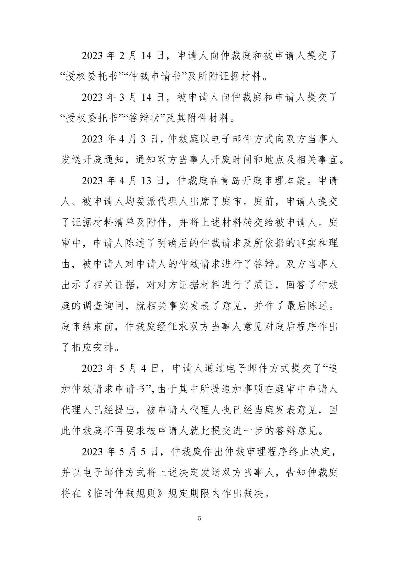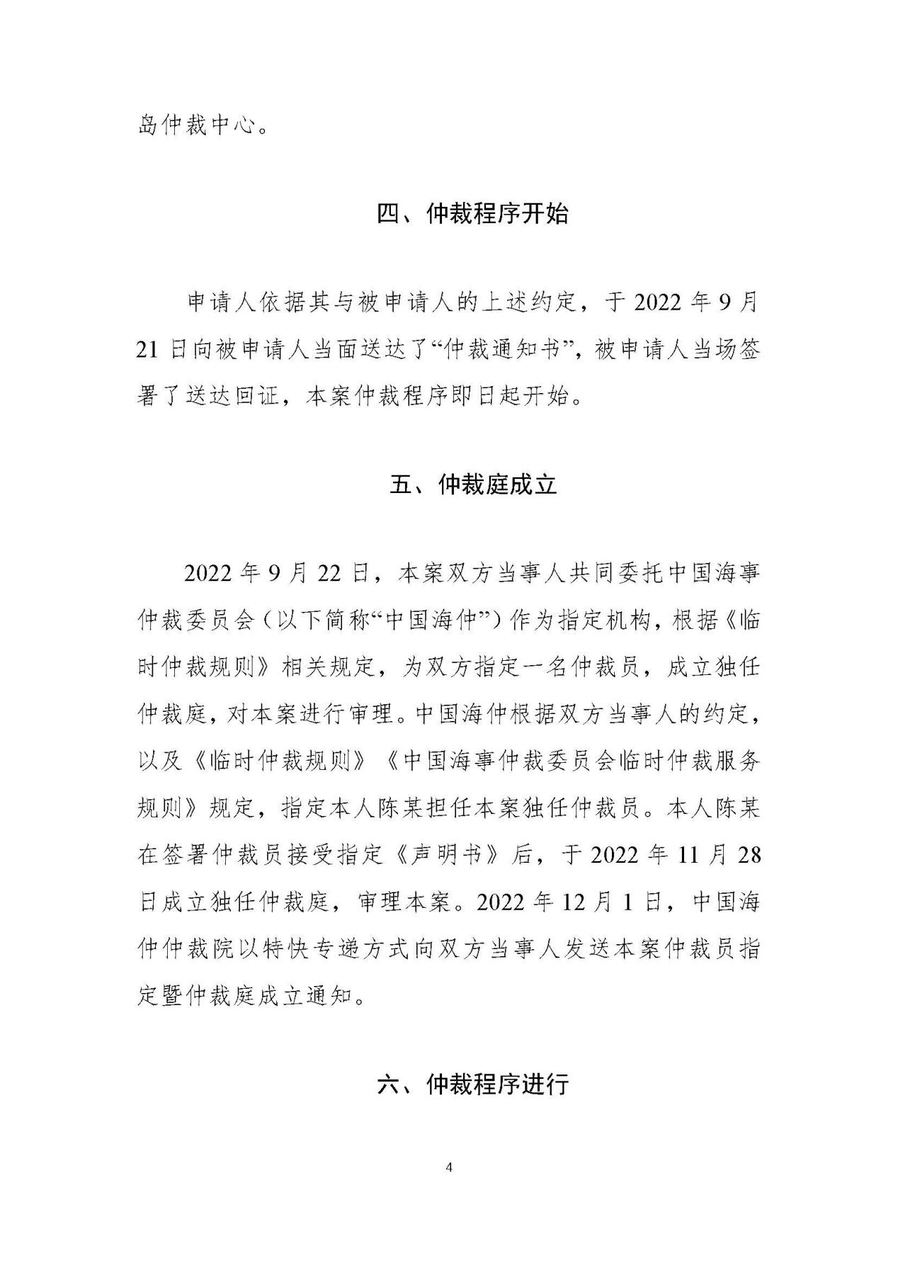 根據(jù)上述約定,申請(qǐng)人按照《海協(xié)臨時(shí)仲裁規(guī)則》規(guī)定,于2022年9月21日向被申請(qǐng)人發(fā)送“仲裁通知書(shū)”,被申請(qǐng)人簽署確認(rèn),仲裁程序自此開(kāi)始。在仲裁程序中,由于雙方當(dāng)事人未能就仲裁員的選定達(dá)成一致意見(jiàn),雙方共同申請(qǐng)由中國(guó)海仲為本案指定一名仲裁員,成立仲裁庭,進(jìn)行審理。根據(jù)雙方當(dāng)事人約定及《海協(xié)臨時(shí)仲裁規(guī)則》《中國(guó)海仲臨時(shí)仲裁服務(wù)規(guī)則》規(guī)定,中國(guó)海仲為該案指定一名仲裁員,成立仲裁庭。此后案件程序全部由仲裁庭依據(jù)《海協(xié)臨時(shí)仲裁規(guī)則》主持進(jìn)行。仲裁庭于2023年4月13日在中國(guó)海仲青島仲裁中心開(kāi)庭審理本案,5月5日作出仲裁審理程序終止決定,6月30日作出仲裁裁決。