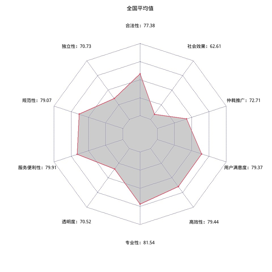 二級指標(biāo)反映的是仲裁價(jià)值的實(shí)現(xiàn)程度。從二級指標(biāo)得分情況來看,得分較高的是服務(wù)便利性、高效性和本地用戶滿意度。得分較低的是社會效果和透明度。社會效果指標(biāo)由兩個(gè)比例構(gòu)成,一是受案標(biāo)的額與仲裁機(jī)構(gòu)所在地國內(nèi)生產(chǎn)總值的比例,二是仲裁機(jī)構(gòu)受理案件數(shù)量與當(dāng)?shù)刂屑壢嗣穹ㄔ菏芾砻裆淌掳讣谋壤V俨脵C(jī)構(gòu)所在地中級人民法院的受案數(shù)量不完整的,以全國仲裁案件占全國民商事訴訟案件的比例為缺失值計(jì)算。仲裁受理民商事案件占訴訟案件比例較低,表明仲裁在促進(jìn)市場經(jīng)濟(jì)建設(shè)、優(yōu)化營商環(huán)境以及完善社會治理體系方面還具有較大的潛力。
