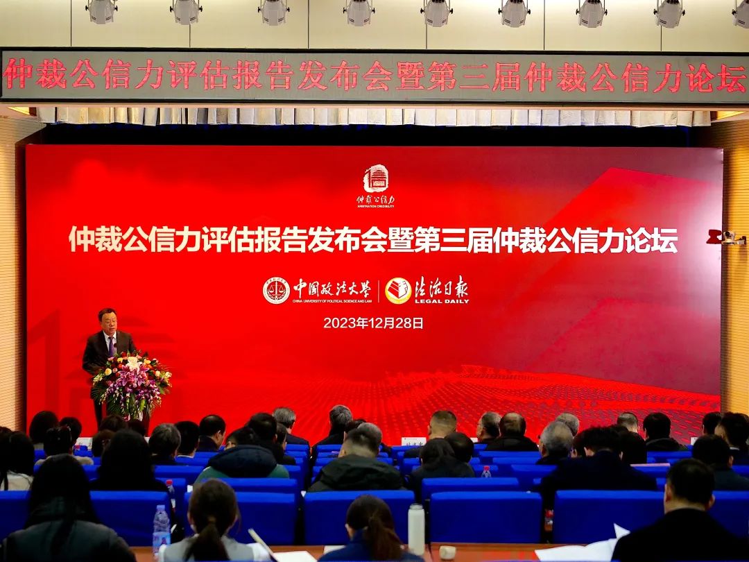 2023年12月28日,仲裁公信力評估報(bào)告發(fā)布會暨第三屆仲裁公信力論壇在中國政法大學(xué)舉行。全國人大常委會法制工作委員會民法室副主任馬正平,司法部公共法律服務(wù)管理局局長楊向斌,最高人民法院法官張梅等國家機(jī)關(guān)代表蒞臨發(fā)布會。中國政法大學(xué)副校長時(shí)建中,中國法學(xué)會副會長、中國政法大學(xué)仲裁研究院理事長黃進(jìn),全國人大常委會法制工作委員會民法室原主任賈東明,司法部公共法律服務(wù)管理局二級巡視員石海,法制日報(bào)社編委、法治網(wǎng)總裁萬學(xué)忠以及專家委員會成員出席發(fā)布會。全國多家仲裁機(jī)構(gòu)領(lǐng)導(dǎo)、律師與企業(yè)代表、高??蒲腥藛T以及媒體代表參會。