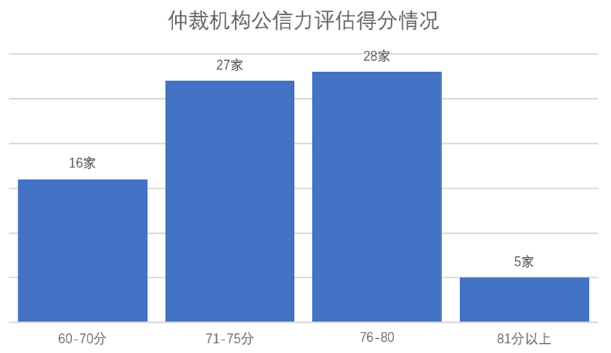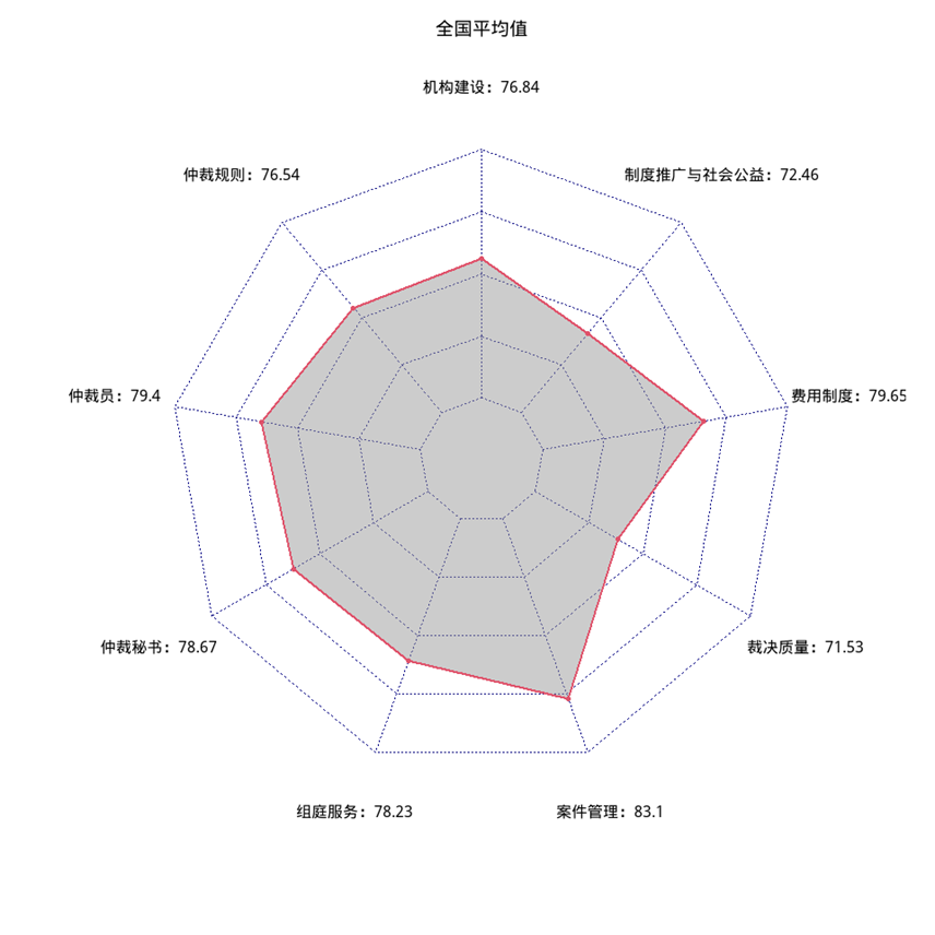 從一級指標(biāo)得分情況來看,受調(diào)研仲裁機(jī)構(gòu)表現(xiàn)較好的指標(biāo)是案件管理。該指標(biāo)主要依據(jù)是仲裁用戶的主觀滿意度評價(jià)。這表明機(jī)構(gòu)所在地的當(dāng)事人對本地機(jī)構(gòu)的評價(jià)較高。我國仲裁發(fā)展不平衡,仲裁資源本地化程度較高,滿意度指標(biāo)橫向可比性較低。該指標(biāo)主要反映機(jī)構(gòu)所在地當(dāng)事人對該仲裁機(jī)構(gòu)的看法。一級指標(biāo)中得分最低的是仲裁裁決,僅為71.5分。仲裁裁決指標(biāo)的評估標(biāo)準(zhǔn)主要是當(dāng)事人向法院申請撤銷仲裁裁決與仲裁機(jī)構(gòu)受案數(shù)量比、法院實(shí)際撤裁與當(dāng)事人申請撤裁案件數(shù)量比以及法院實(shí)際撤裁案件與仲裁機(jī)構(gòu)受理案件數(shù)量比。該項(xiàng)指標(biāo)評估依據(jù)來源權(quán)威,效度較高,可以部分反映仲裁公信力建設(shè)的實(shí)際情況。