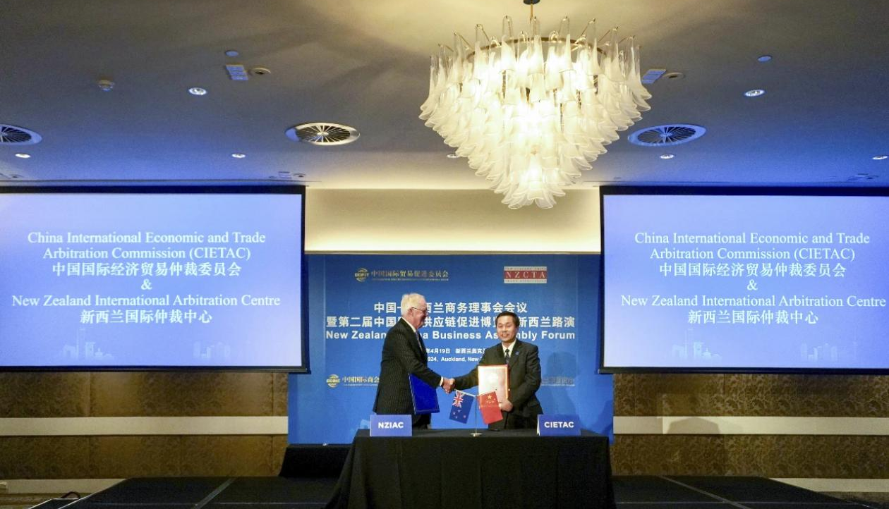 2024年4月19日,在中國貿促會會長任鴻斌率中國企業(yè)家代表團訪問新西蘭期間,中國國際經濟貿易仲裁委員會(以下簡稱“貿仲”)副主任兼秘書長王承杰與新西蘭國際仲裁中心主任約翰·格林(John Green),在奧克蘭于中國—新西蘭商務理事會會議上簽署了合作協(xié)議。中國貿促會會長任鴻斌、新西蘭中國貿易協(xié)會主席約翰·考克倫(John Cochrane)、中國駐新西蘭大使王小龍、駐奧克蘭總領事陳世杰等出席簽約儀式。