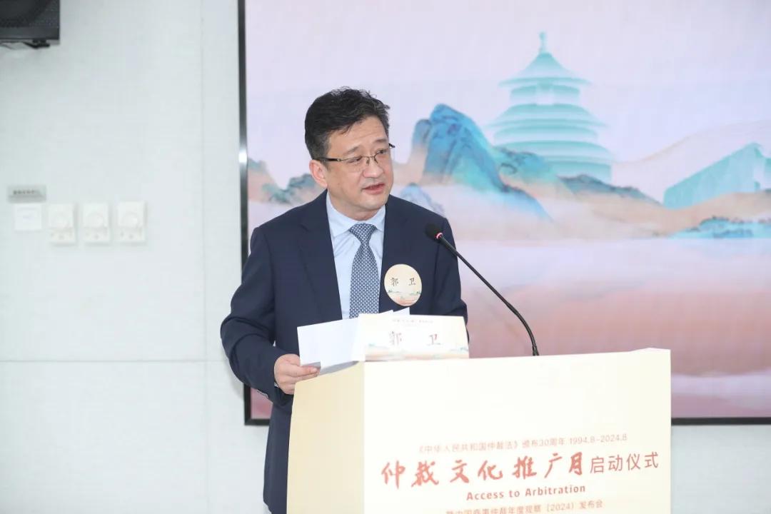 郭衛(wèi)在致辭中表示,仲裁文化是提升仲裁公信力的重要源泉,為仲裁機(jī)構(gòu)建設(shè)注入內(nèi)生動(dòng)力,并為仲裁從業(yè)人員提供智識(shí)支持。在仲裁法頒布30周年之際,啟動(dòng)仲裁文化推廣月活動(dòng)正當(dāng)其時(shí)。北京律協(xié)一直支持并積極推動(dòng)首都仲裁事業(yè)的發(fā)展,北京律協(xié)商事仲裁法律專業(yè)委員會(huì)是全國(guó)首家且最大規(guī)模的仲裁專委會(huì),代表了律師行業(yè)中先進(jìn)的仲裁力量。北京律師也以專業(yè)能力強(qiáng)、職業(yè)素養(yǎng)高在業(yè)內(nèi)享有盛譽(yù)。通過與北京律協(xié)共同舉辦仲裁文化推廣月活動(dòng)將會(huì)在相當(dāng)大的范圍內(nèi)弘揚(yáng)傳播仲裁文化。同時(shí),他表達(dá)了對(duì)未來的期待,希望通過仲裁文化推廣月期間的一系列豐富、專業(yè)活動(dòng),邀請(qǐng)各界共同參與,以多元視角推出一套推廣仲裁文化的“組合拳”。他強(qiáng)調(diào),當(dāng)前我國(guó)正積極打造國(guó)際一流仲裁機(jī)構(gòu)和建設(shè)國(guó)際商事仲裁中心,通過仲裁文化推廣月這一平臺(tái),借助各界同仁對(duì)仲裁文化的深度思考,提煉出國(guó)際仲裁文明的共通元素,共同構(gòu)建以中國(guó)文化底蘊(yùn)為基礎(chǔ)的中國(guó)特色仲裁文化。在為仲裁機(jī)構(gòu)加強(qiáng)自身文化建設(shè)提供思考的同時(shí),推動(dòng)中國(guó)仲裁走出一條承載中國(guó)仲裁文化基因、吸納世界仲裁制度營(yíng)養(yǎng)的健康發(fā)展之路。