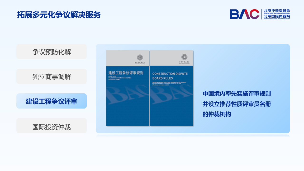 北仲在2009年即頒布了《建設(shè)工程爭議評審規(guī)則》,是中國境內(nèi)率先實施評審規(guī)則并設(shè)立推薦性質(zhì)評審員名冊的仲裁機(jī)構(gòu)。這一規(guī)則在實踐中多次被當(dāng)事人選擇適用,并成功助力當(dāng)事人快速解紛。同時,這一規(guī)則也為聯(lián)合國貿(mào)法會第二工作組于2022年啟動的審裁規(guī)則的制定提供了中國經(jīng)驗。