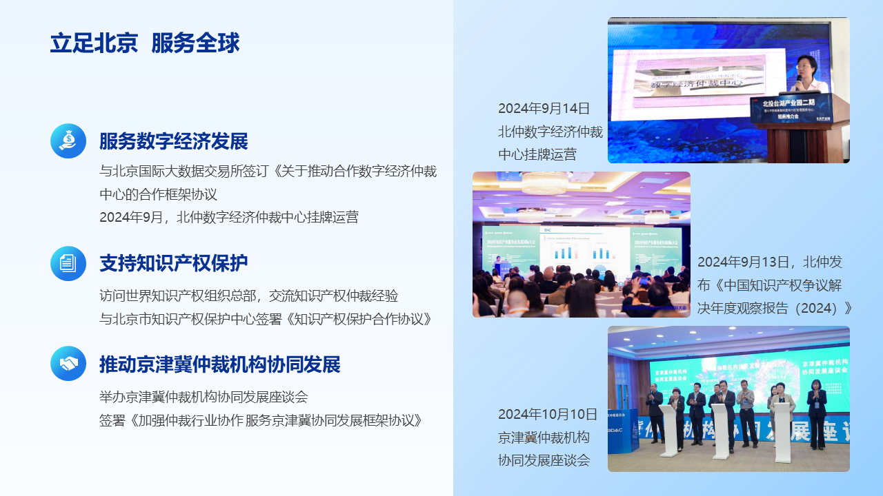 發(fā)揚(yáng)仲裁靈活高效的特色,北仲與北京國際大數(shù)據(jù)交易所簽訂《關(guān)于推動合作數(shù)字經(jīng)濟(jì)仲裁中心的合作框架協(xié)議》,并在此協(xié)議基礎(chǔ)上共同建設(shè)北仲數(shù)字經(jīng)濟(jì)仲裁中心。保護(hù)科創(chuàng)成果,維護(hù)科創(chuàng)市場,北仲積極推動與有關(guān)單位在知識產(chǎn)權(quán)領(lǐng)域的交流合作。推動京津冀仲裁機(jī)構(gòu)協(xié)同發(fā)展,北仲同十三家京津冀地區(qū)仲裁機(jī)構(gòu)和河北省司法廳、河北省仲裁協(xié)會舉辦京津冀仲裁機(jī)構(gòu)協(xié)同發(fā)展座談會。