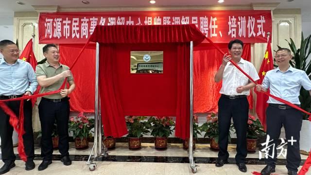 河源市司法局黨組書(shū)記、局長(zhǎng)李慶鐸,河源市民政局黨組成員、二級(jí)調(diào)研員李琦,河源市民商事務(wù)調(diào)解中心理事長(zhǎng)、河源仲裁委員會(huì)主任藍(lán)鋒,河源市民商事務(wù)調(diào)解中心秘書(shū)長(zhǎng)吳松為調(diào)解中心揭牌。
