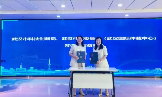 武漢市科技創(chuàng)新局黨組書記、局長董丹紅和武漢仲裁委辦黨組書記、主任羅平分別代表雙方單位簽署合作備忘錄。