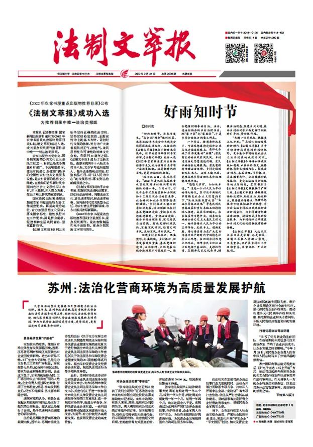 在全國(guó)“兩會(huì)”勝利閉幕、北京2022年冬奧會(huì)和冬殘奧會(huì)取得圓滿(mǎn)成功之際,改版后的《法制文萃報(bào)》迎來(lái)了光榮的使命和擔(dān)當(dāng)。經(jīng)中央宣傳部組織專(zhuān)家評(píng)審,《法制文萃報(bào)》成功入選《2022年農(nóng)家書(shū)屋重點(diǎn)出版物推薦目錄》,成為目錄中唯一法治類(lèi)報(bào)紙。這是新時(shí)代的召喚,更是新征程的擔(dān)當(dāng)。