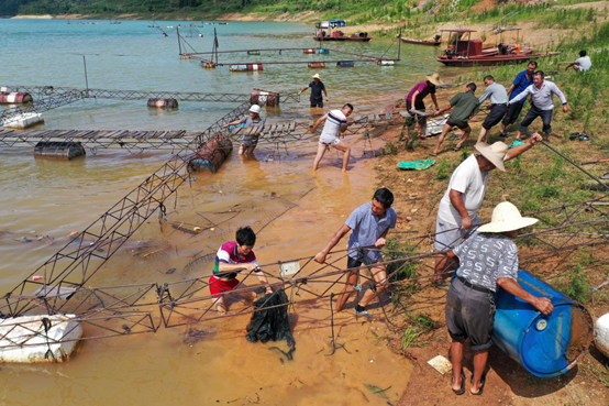 湖南省資興市加強(qiáng)跨部門協(xié)作,聯(lián)合實(shí)施東江湖網(wǎng)箱養(yǎng)殖退水上岸工程和清船、清網(wǎng)、清江、清庫退捕禁捕“四清四無”專項(xiàng)行動(dòng)。