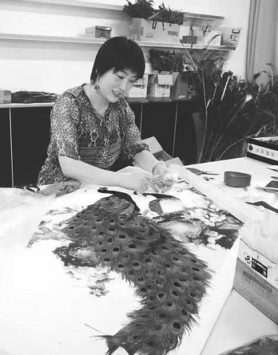 安徽省阜陽(yáng)市“巾幗新農(nóng)人”、安徽藍(lán)翎生態(tài)農(nóng)業(yè)科技有限公司董事長(zhǎng)關(guān)麗在制作孔雀羽毛壁畫(huà)。