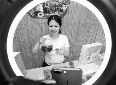 安徽省黃山市“巾幗新農(nóng)人”、祁門(mén)縣際源春茶業(yè)有限公司總經(jīng)理江雪霞在直播銷(xiāo)售粽茶。 陳晨/攝