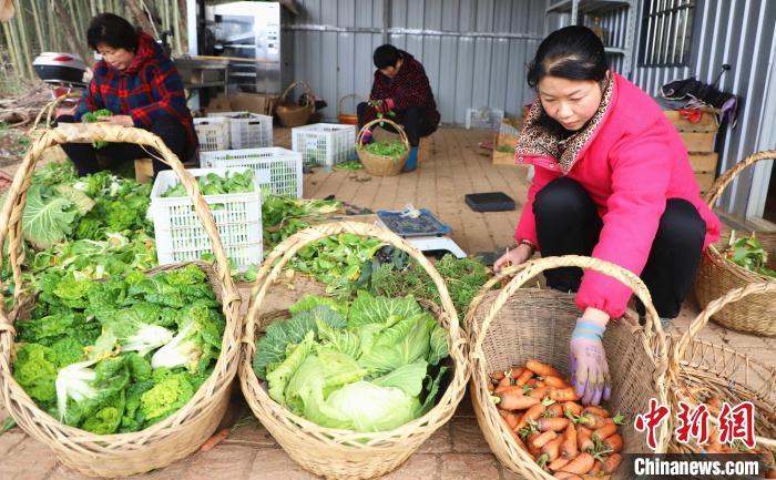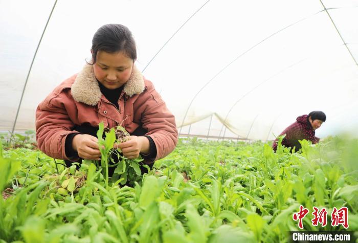 2月14日,安徽省肥西縣紫蓬山旅游開(kāi)發(fā)區(qū)張老圩村風(fēng)之谷家庭農(nóng)場(chǎng)內(nèi),農(nóng)民在給菜地澆水,采摘、分揀新鮮蔬菜供應(yīng)市場(chǎng),田間地頭一派繁忙景象。