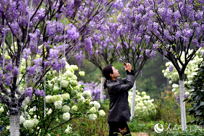 4月6日,江西省上饒市廣豐區(qū)大南鎮(zhèn)新塘的中華木繡球博覽園里游客如織,當(dāng)前,正值木繡球的盛開期,白的如雪、綠的如玉,加上紫藤、茶梅的襯托,整個博覽園顯得清新淡雅,游客們徜徉其中賞花打卡,好不自在。