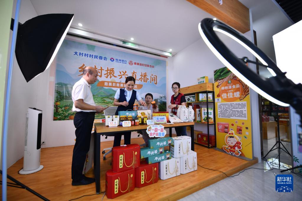 6月14日,在鹿寨縣鹿寨鎮(zhèn)大村村,村干部和村民在準(zhǔn)備直播帶貨。記者 黃孝邦 攝