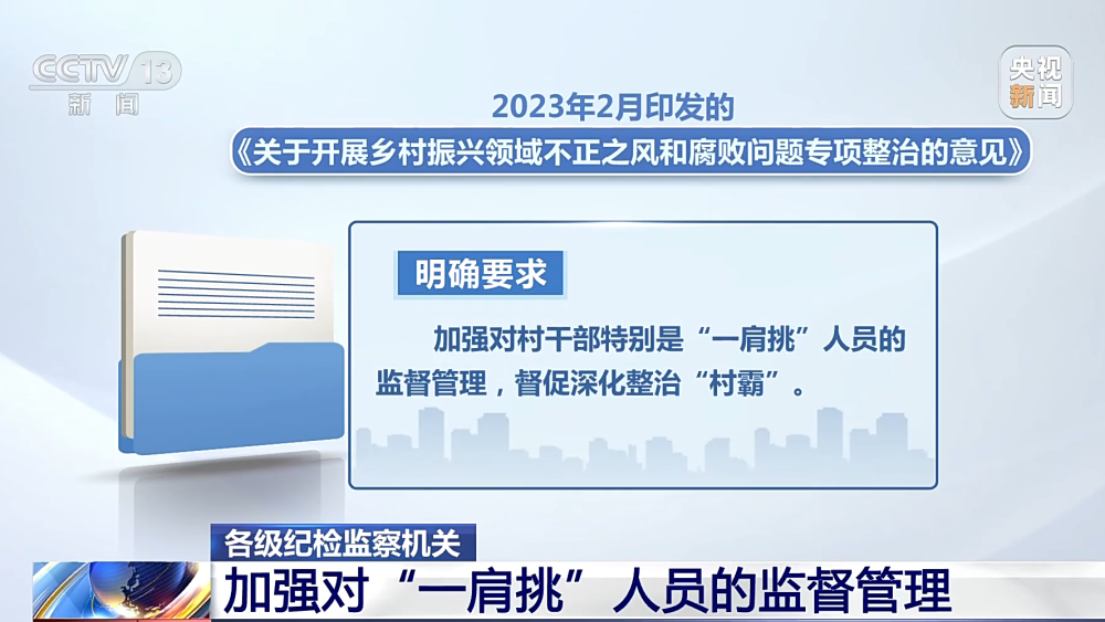 今年2月印發(fā)的《關(guān)于開展鄉(xiāng)村振興領(lǐng)域不正之風(fēng)和腐敗問題專項(xiàng)整治的意見》就明確要求,加強(qiáng)對村干部特別是“一肩挑”人員的監(jiān)督管理,督促深化整治“村霸”。