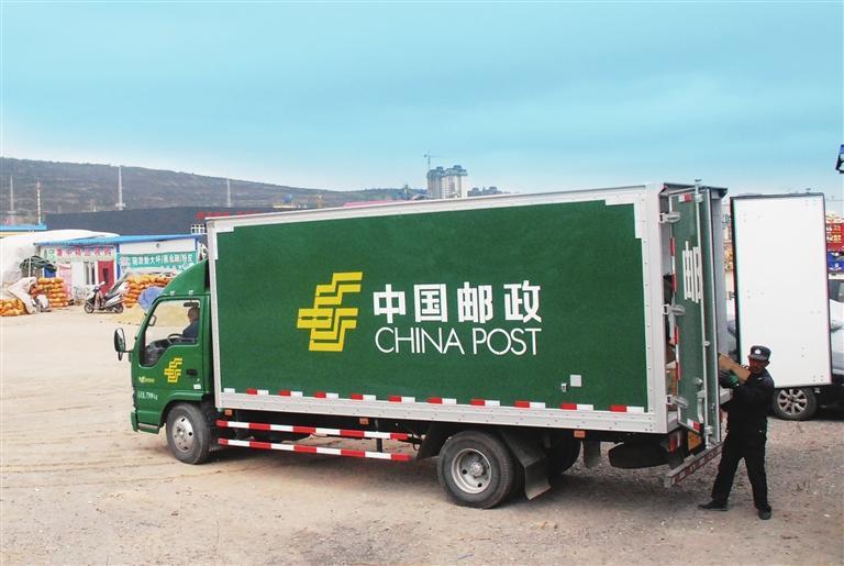 工作人員卸載郵車上的農(nóng)特產(chǎn)品