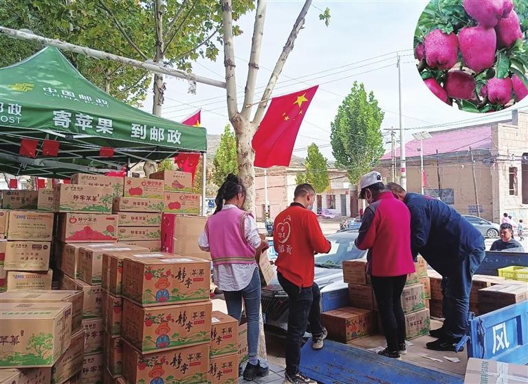 靜寧縣郵政分公司工作人員幫助果農(nóng)打包收寄蘋果