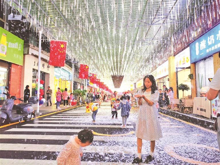 這是一個(gè)曾經(jīng)門可羅雀的小區(qū)商區(qū),建在一個(gè)低矮的斜坡上。以前,車輛亂停亂放,環(huán)境臟亂差,一排排門面成為閑置資產(chǎn)。去年夏天,為緩解城北奢香古鎮(zhèn)夜間經(jīng)濟(jì)人客爆滿的壓力,同時(shí)發(fā)展地?cái)偨?jīng)濟(jì)增加居民就業(yè),紅旗街道利用這批閑置門面,投入150萬元打造夜間燈光秀和進(jìn)行墻體文化建設(shè),成功改造為豆干美食一條街,收到了立竿見影的效果。