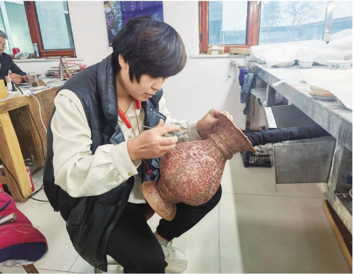 近日,饒陽縣億澤景泰藍工藝品廠內,脫貧群眾正在為景泰藍填充色釉(資料圖)