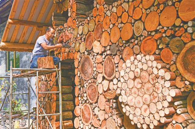 酉陽花田鄉(xiāng)何家?guī)r村,工人正在搭建木藝墻,讓藝術融入鄉(xiāng)村 特約攝影 冉川