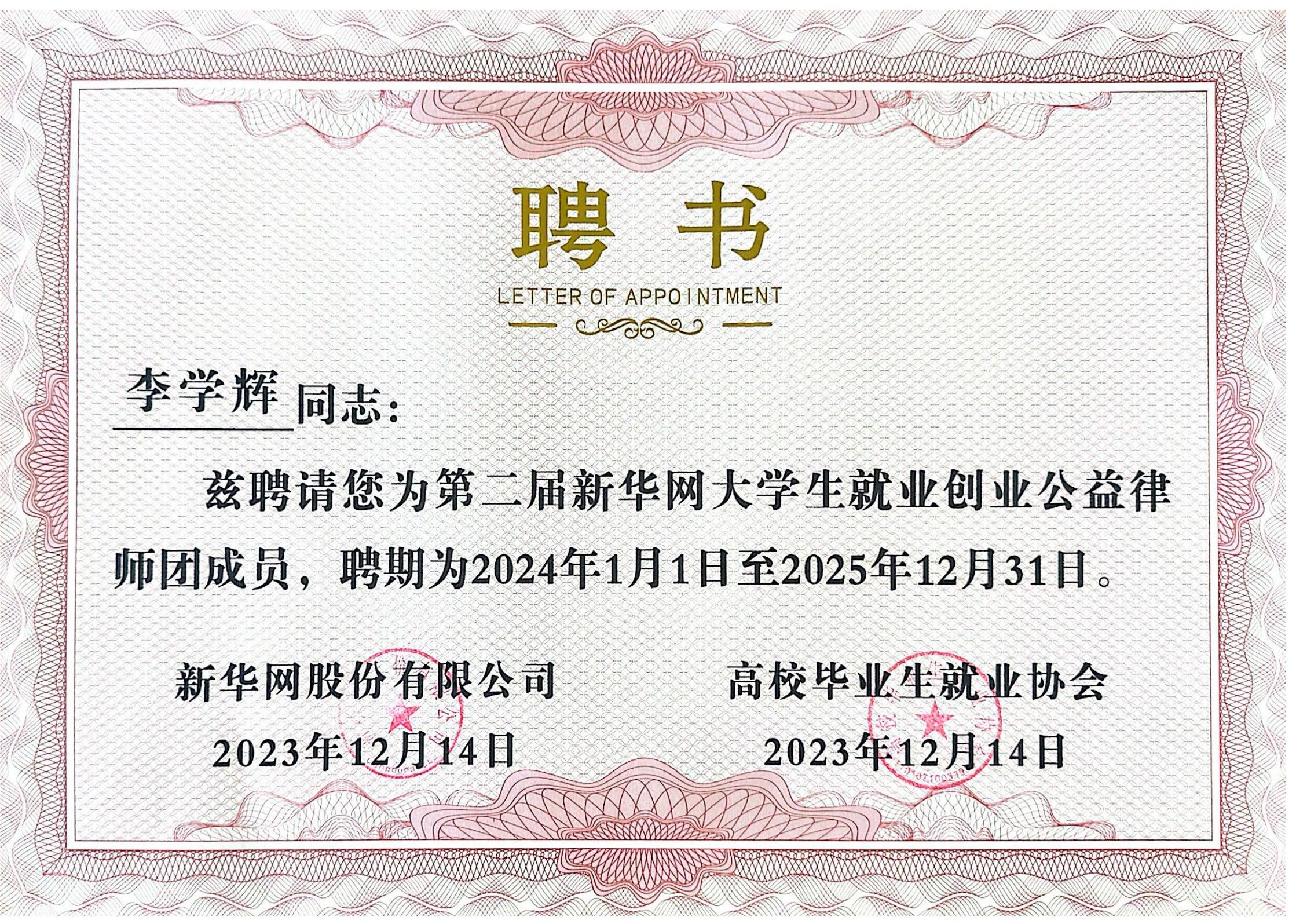 北京市安理律師事務(wù)所黨委副書記、管委會委員李學(xué)輝律師憑借扎實的法律功底、過硬的專業(yè)素養(yǎng)、應(yīng)有的責任擔當,受聘擔任新華網(wǎng)大學(xué)生就業(yè)創(chuàng)業(yè)公益律師團成員。