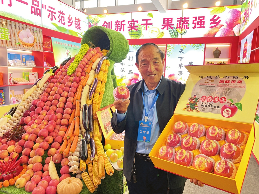 社長(zhǎng)王萬保在展示合作社文化藝術(shù)蘋果 張新征 攝