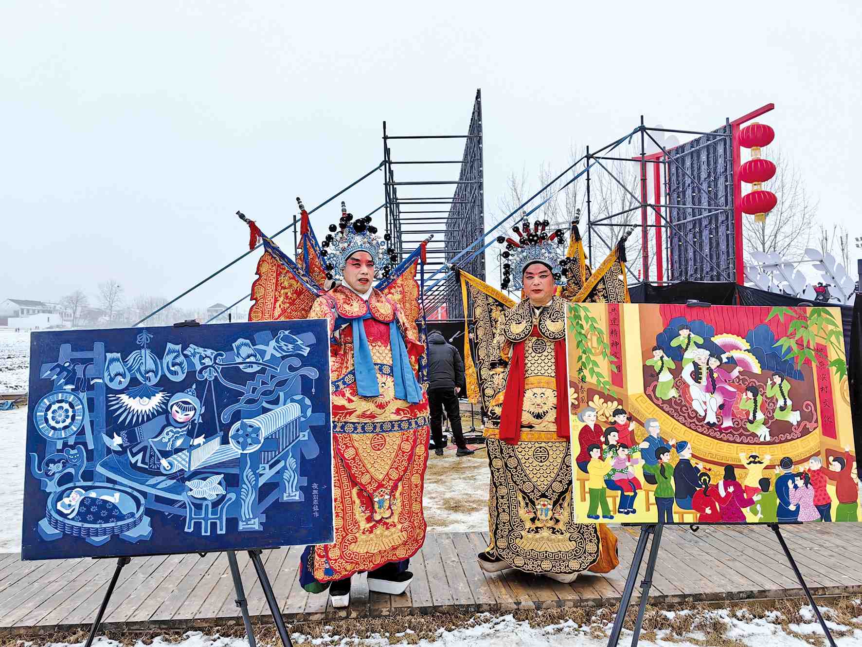 在年畫展覽旁候場的演員