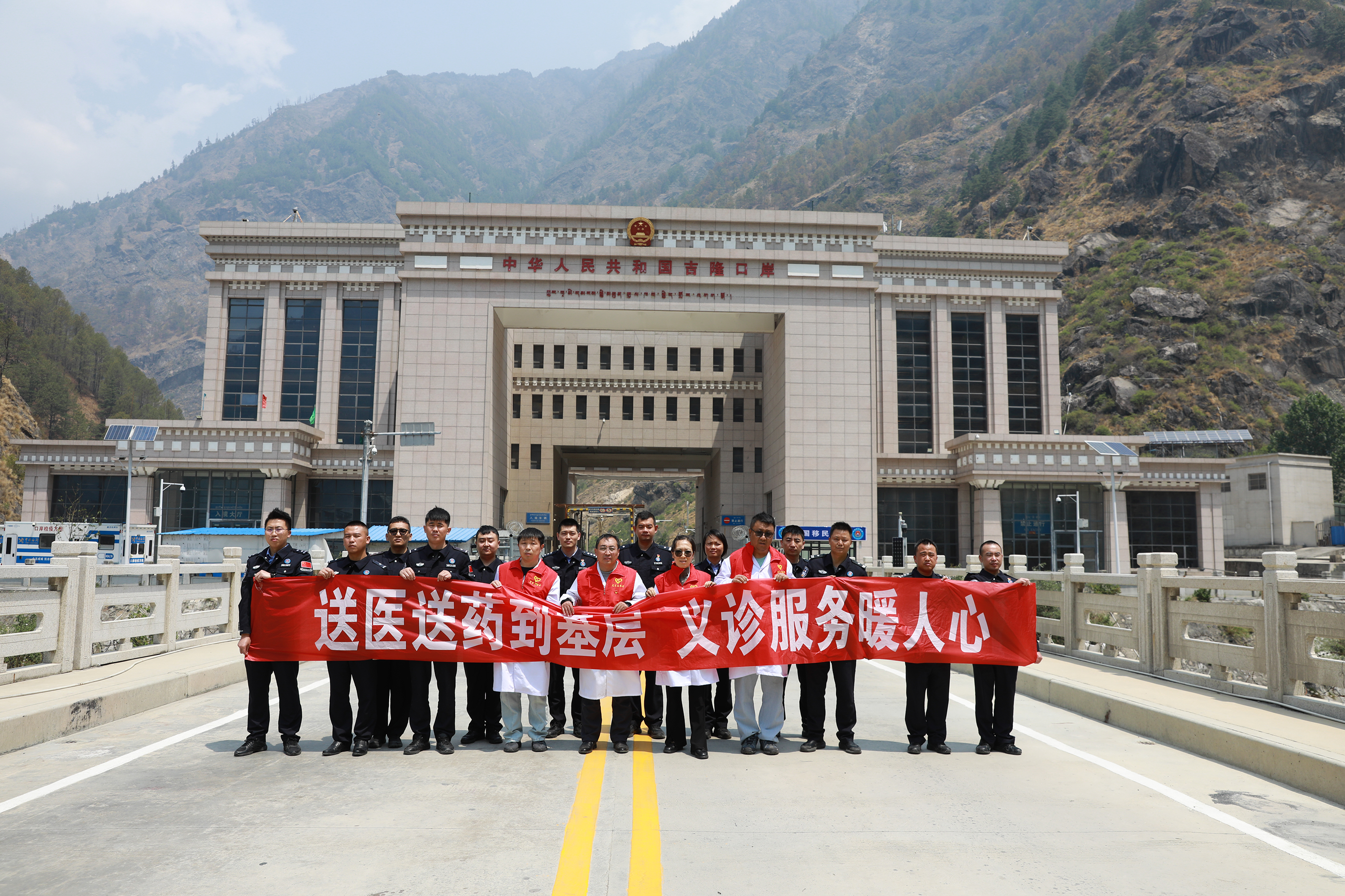 吉隆口岸醫(yī)院義診醫(yī)生與戍邊民警在國門前合影 肖富貴 攝