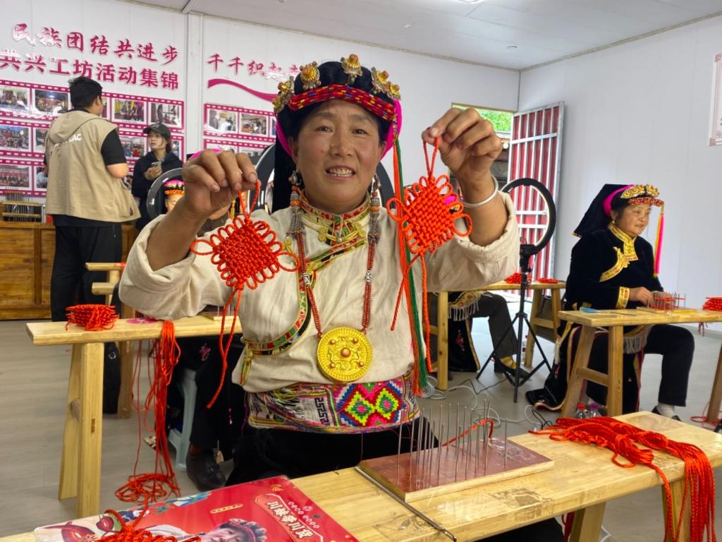 “金東—丹巴巾幗共興工坊”內(nèi),一位繡娘向記者展示剛編好的中國結(jié) 記者 周以航 攝