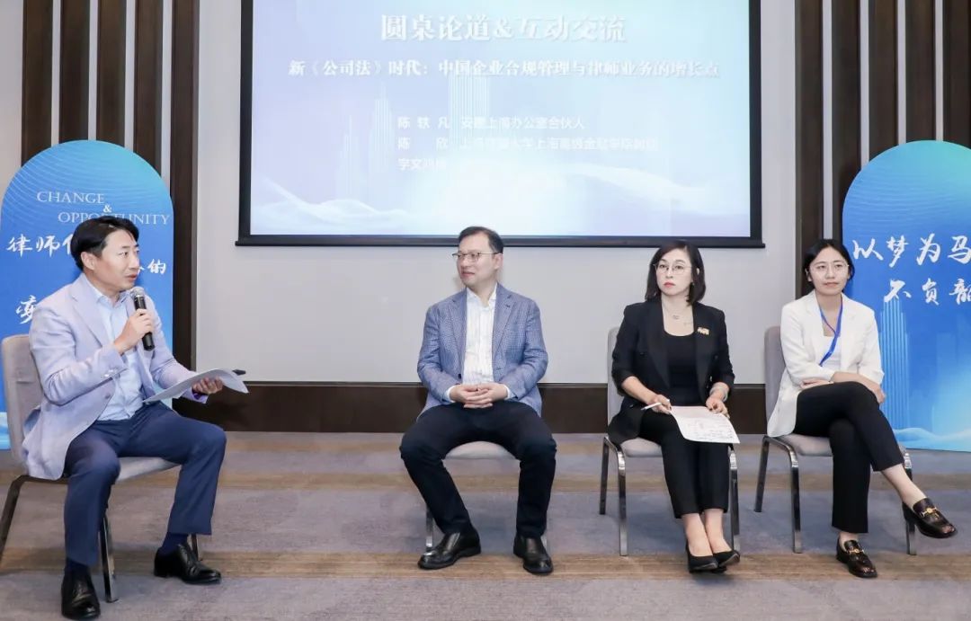 新《公司法》的實(shí)施為企業(yè)合規(guī)管理設(shè)置了很多新的課題,亦為律師展業(yè)提供了許多新的機(jī)會(huì)。為此,青年律師該如何“借勢”,化挑戰(zhàn)為機(jī)遇,實(shí)現(xiàn)個(gè)人成長?圍繞此話題,陳欣教授、安理合伙人宇文鴻雁律師、青年律師代表劉豆律師給出了諸多有益建議。陳軼凡律師擔(dān)任本環(huán)節(jié)主持。