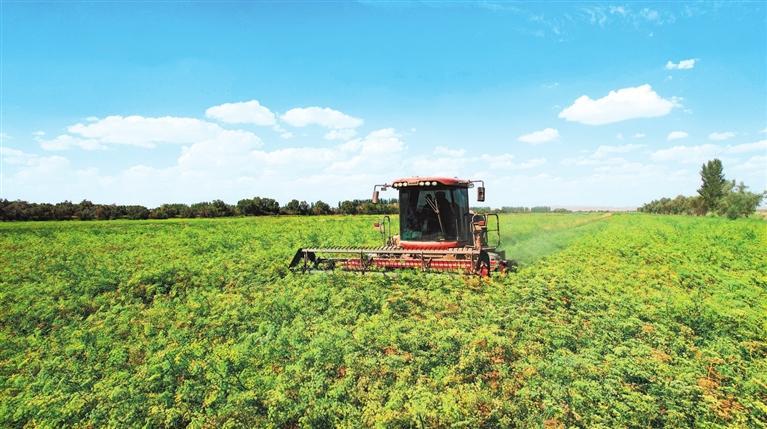 但見地里的苜蓿有高有低、呈波浪狀?!澳闱?,我們農(nóng)場進行植株高低搭配,將個頭較高的WJ363HK苜蓿與個頭低的阿蒂娜間作套種,當苜蓿大面積開花時,能充分享受陽光,提高苜蓿牧草的粗蛋白含量?!壁w富強說著算了一筆賬:今年6月10日到20日,頭茬苜蓿成熟,19臺大型機械搶趕時間,一個多星期就收割結束,保障了粗蛋白含量高達20%以上;目前第二茬苜蓿只有40厘米高,長到7月下旬80厘米左右即可收割;第三茬苜蓿到9月中下旬時收割。1畝苜蓿收割3茬、可產(chǎn)900公斤至1噸干草,按照目前市場價1噸干草1600至1800元計算,收益可觀。