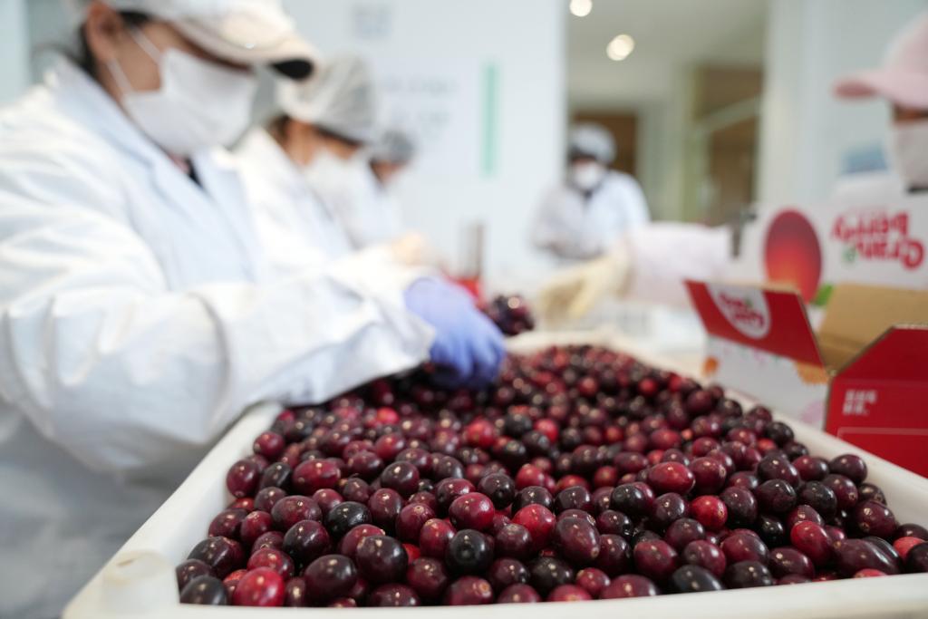 1月29日,在黑龍江省撫遠(yuǎn)市蔓越莓種植基地,工作人員分揀蔓越莓鮮果 記者 王建威 攝
