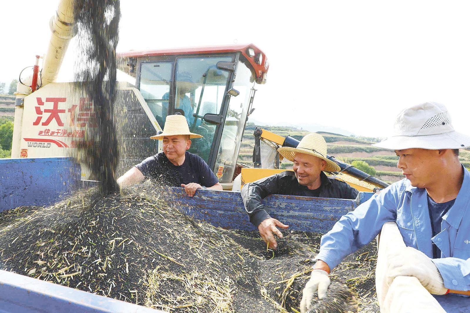 在一處坡洼的田塊里,一臺聯(lián)合收割機正在卸糧,收獲的油菜籽從卸糧口傾瀉而下,倒入三輪車斗里。“這塊田以前是撂荒地,我們合作社流轉(zhuǎn)后種植了油菜。今年雨水好,看莊稼長勢,油菜籽畝均產(chǎn)量至少在150公斤以上?!睆埣仪f村黨支部書記張斌先和村支部委員寧智祥捧起一把黑黝黝的油菜籽,臉上露出收獲的喜悅。