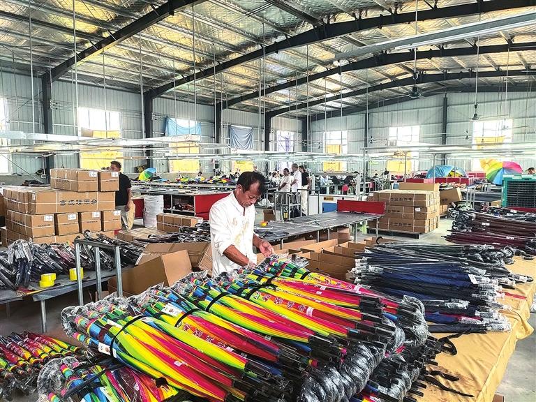 2021年6月至2023年12月,該鎮(zhèn)以點帶面、擴(kuò)大規(guī)模、提升產(chǎn)能,以管理區(qū)為單位建立規(guī)模廠,以村為單位建立加工工坊,以家庭為單位建立加工戶,把適合家庭生產(chǎn)的加工環(huán)節(jié)更多地延伸到農(nóng)戶家中,推動產(chǎn)業(yè)規(guī)模快速擴(kuò)大。目前,全鎮(zhèn)利用村閑置村部、學(xué)校、廠房、民宅等建成規(guī)模廠11家、制傘工坊20個、加工戶1000多戶,培育4個自主品牌,幾十個品種,上百款樣式,年產(chǎn)雨傘2000萬把、傘架4000萬支,年產(chǎn)值5億多元,帶動就業(yè)2000余人。真正把產(chǎn)業(yè)鏈實體留在縣域,將更多就業(yè)崗位留在鄉(xiāng)村,帶動群眾在家門口就近就便就業(yè)、就地城鎮(zhèn)化,養(yǎng)老帶小、上班掙錢、農(nóng)忙種地“三不誤”。