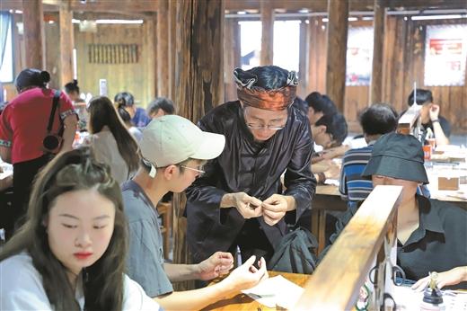 當下,“非遺+旅游”成了苗寨文旅融合發(fā)展的新熱點。當?shù)匾劳蟹沁z資源優(yōu)勢,圍繞蠟染、刺繡、銀飾等非遺文化,推出非遺研學體驗文旅項目,吸引了大批游客前來。
