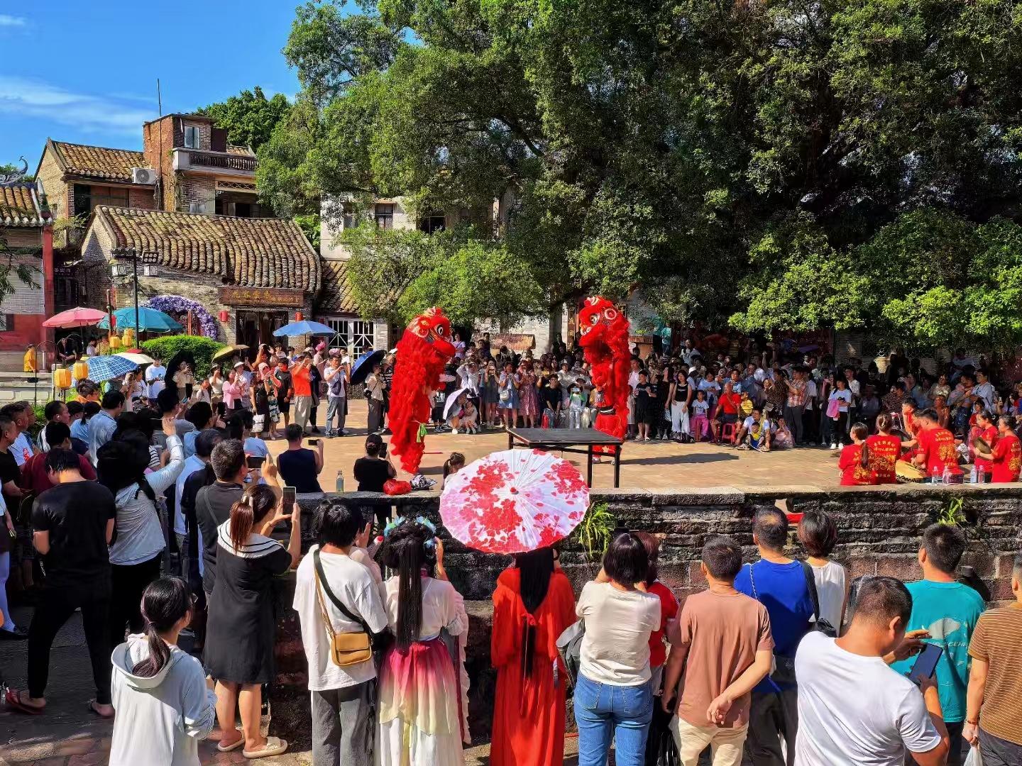 國(guó)慶假期,不少游客走進(jìn)廣東省東莞市茶山鎮(zhèn)南社明清古村落,在舞獅、粵劇、太極表演、農(nóng)耕巡游、婚嫁巡游等具有嶺南特色的民俗活動(dòng)中,感受800年南社的悠悠古韻。南社創(chuàng)意公司運(yùn)營(yíng)總監(jiān)陳玲介紹,國(guó)慶期間,南社村的客流量比平日有明顯提升?!斑@里風(fēng)景優(yōu)美,傳統(tǒng)文化氛圍濃厚,是短途旅行的好選擇?!庇慰腿~先生表示。