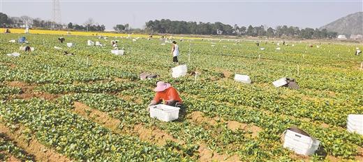 在高路村1000畝供港蔬菜基地里,閃現(xiàn)不少忙碌的身影。這里每天都有三四十名工人采摘時令蔬菜,以便及時供應(yīng)粵港澳大灣區(qū)及周邊超市。