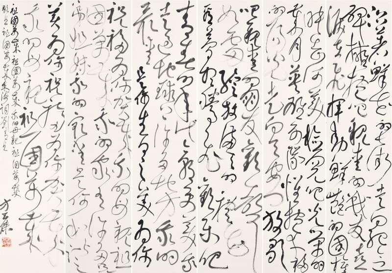 展覽作品《祖國(guó)萬(wàn)歲》朱海 詞 劉青 曲 大草灰宣六條屏-230cm×54cm×6(主辦方供圖)