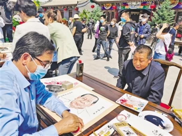 “畫畫我們村的‘明星’”活動中,書畫家為村民畫像