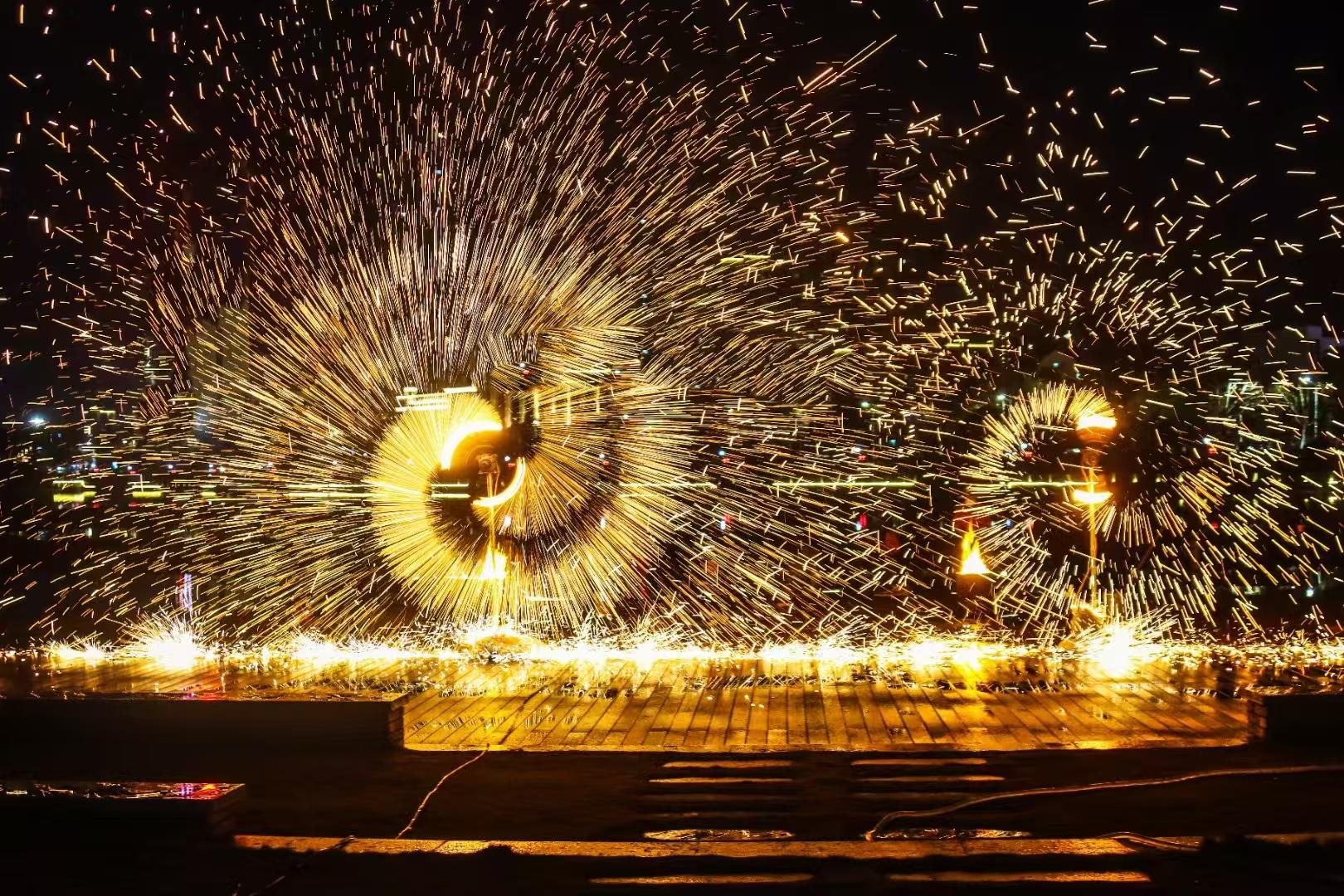 湖北黃岡遺愛湖畔的打鐵花表演