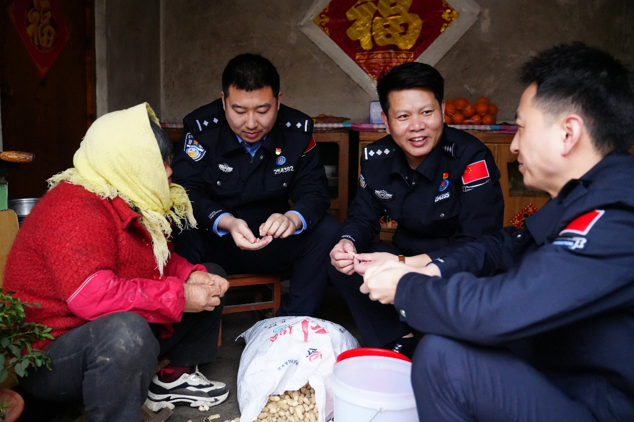 據(jù)了解,董翠蓮老人患有眼疾,孤身照顧身有殘疾的老伴已有20余年。當(dāng)民警楊曉龍、胡云龍、李虎一行走進(jìn)董翠蓮老人家中時(shí),老人正在屋里剝花生?!按竽?,我們來幫您!”民警們立即放下手中的慰問品,圍坐在老人身邊剝起花生來?!皠傁峦暧?,風(fēng)大,您年齡大了出門不安全,有什么需要給我們打電話?!薄白罱秒姟⒂脷庖欢ㄒ⒁獍踩?!”……句句關(guān)懷、聲聲叮嚀讓老人感動(dòng)不已。盡管雨后的天空陰沉沉的,但警民嘮嗑的笑聲在小院里此起彼伏?!斑@些孩子比親兒子還貼心,經(jīng)常來看我和我老伴,這次又送來這么多東西?!倍渖徖窬氖植蛔】滟?。