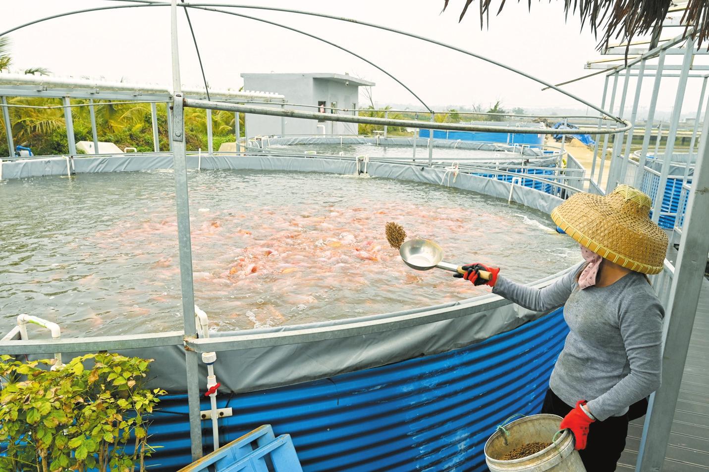 ??诩蠗派浆F(xiàn)代農(nóng)業(yè)工廠化養(yǎng)種產(chǎn)業(yè)基地內(nèi),工作人員在喂養(yǎng)咸淡水紅鯛魚。記者 石中華 攝