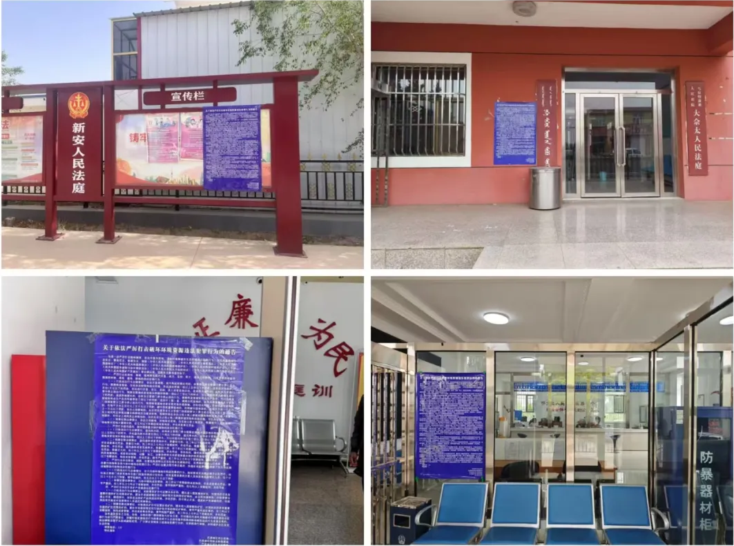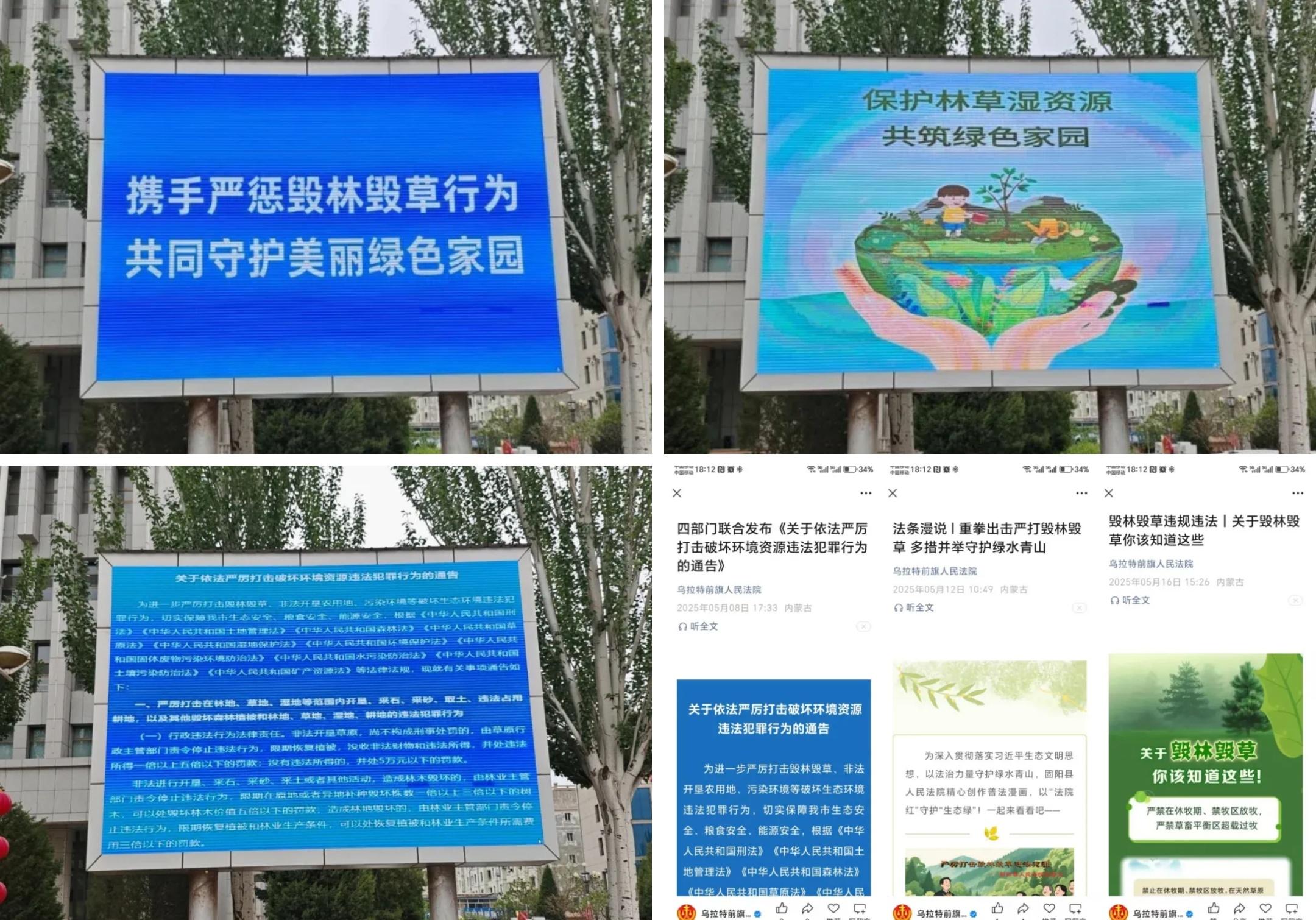 為鞏固宣傳成效,營(yíng)造濃厚宣傳氛圍,烏拉特前旗人民法院開(kāi)展了形式多樣的宣傳舉措。一是利用戶外LED電子顯示屏圍繞毀林毀草主題每日循環(huán)播放圖片及視頻;二是同時(shí)在5個(gè)基層法庭公示欄等顯眼位置張貼《關(guān)于嚴(yán)厲打擊毀林毀草違法犯罪行為的通告》等海報(bào)10余張;三是積極利用微信公眾號(hào)等多媒體平臺(tái),轉(zhuǎn)發(fā)有關(guān)毀林毀草的相關(guān)文章及法律條文,引導(dǎo)群眾從“被動(dòng)守法”轉(zhuǎn)向“主動(dòng)護(hù)綠”。