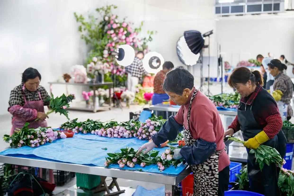 2025年4月,杭坪鎮(zhèn)烏漿村鮮花基地內(nèi),工人們正在分揀打包鮮切花。(受訪者供圖)