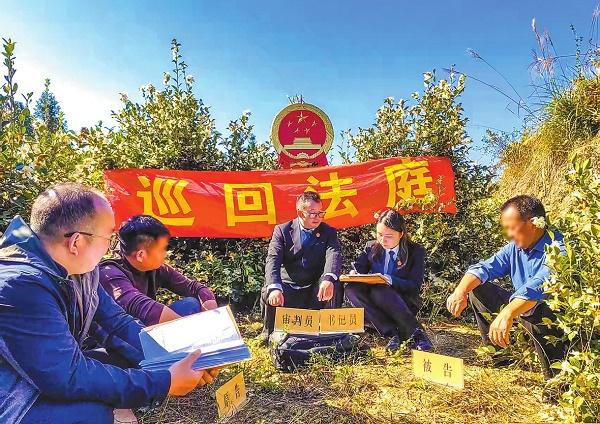 圖為重慶市酉陽土家族苗族自治縣人民法院酉酬人民法庭庭長陳長周在油茶林里現(xiàn)場開庭審理合同糾紛。資料圖片