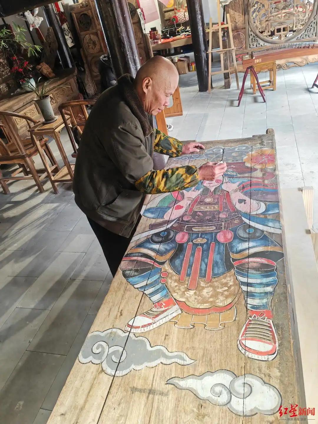 2月10日上午,“萬千氣象看四川”大型主題采訪活動走進四川南充市閬中古城,在古城北街的門神畫展示中心,省級非物質(zhì)文化遺產(chǎn)“閬中門神畫”傳承人張桅正在店里一塊木門板上創(chuàng)作門神畫。不同于很多地方是貼門神畫,閬中的門神是直接“畫”到大門上去的,色澤古樸,栩栩如生。