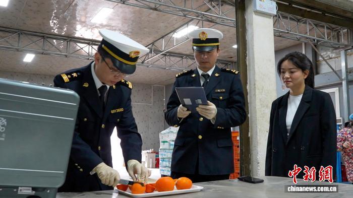 海關(guān)工作人員對(duì)橙子進(jìn)行檢測(cè)。毛文濤 攝
