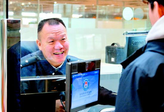 圖為北京邊檢總站執(zhí)勤三大隊(duì)執(zhí)勤三隊(duì)民警李岳云正在為旅客辦理出境手續(xù)。